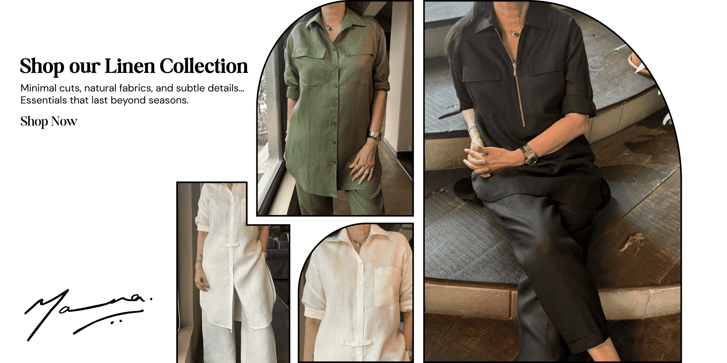 Mana – A clothing brand designed for women who prioritize comfort, style, and sustainability. Crafted from ethically sourced fabrics, the clothing offers a luxurious feel while promoting eco-consciousness. With clean lines and timeless aesthetics, each piece features subtle colors that seamlessly blend into any wardrobe, emphasizing the brand's commitment to both comfort and aesthetics.